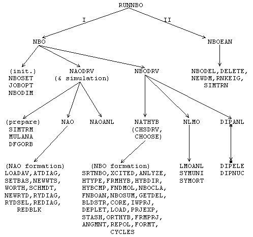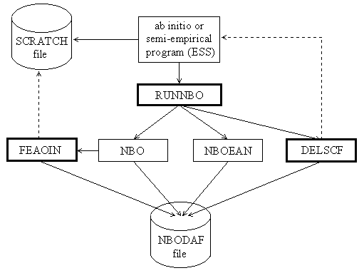 A.1.2 Structure of the NBO Program The overall logical structure of the NBO program and its attachment to an electronic structure system (ESS) are illustrated in the block diagram, Fig. 1. This figure illustrates how the ESS and its scratch files (in the upper part of the diagram) communicate through the interface routines RUNNBO, FEAOIN, and DELSCF with the main NBO modules and associated direct access file (in the lower part). The main NBO program is represented by modules labelled "NBO" and "NBOEAN." These refer to the construction of NBOs (including natural population analysis, construction of NAOs, NLMOs, etc.) and to NBO energy analysis, respectively. Each module consists of subroutines and functions that perform the required operations. These two modules communicate with the direct-access disk file NBODAF (LFN 48, labelled "FILE48" elsewhere in this manual) that is created and maintained by the NBO routines. Details of the NBO and NBOEAN modules, common blocks, and direct-access file are described in the Programmer's Guide, Section C. The NBO program blocks communicate with the attached ESS through three system-dependent 'driver' subroutines (RUNNBO, FEAOIN, DELSCF). The purpose of these drivers is to load needed information about the wavefunction and various matrices into the FILE48 direct access file and NBO common blocks. Although the ESS is usually thought of as 'driving' the NBO program, from the point of view of the NBO program the ESS is merely a 'device' that provides initial input (e.g., a density matrix and label information) or other feedback (a calculated energy value) upon request. Each such ESS device therefore requires special drivers to make this feedback possible. Versions of the driver subroutines are included for several popular packages. The driver routines are described in more detail in the Programmer's Guide, Section C.