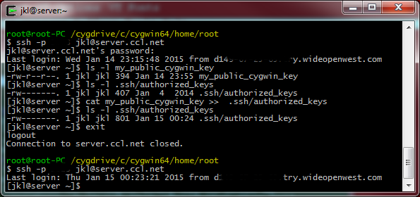 root@root-PC /cygdrive/c/cygwin64/home/root $ ssh -p 2345 jkl@server.ccl.net jkl@server.ccl.net's password: ********* Last login: Wed Jan 14 23:15:48 2015 from d143-67-21-87.try.wideopenwest.com [jkl@server ~]$ ls -l my_public_cygwin_key -rw-r--r--. 1 jkl jkl 394 Jan 14 23:55 my_public_cygwin_key [jkl@server ~]$ ls -l .ssh/authorized_keys -rw-------. 1 jkl jkl 407 Jan 4 2014 .ssh/authorized_keys [jkl@server ~]$ cat my_public_cygwin_key >> .ssh/authorized_keys [jkl@server ~]$ ls -l .ssh/authorized_keys -rw-------. 1 jkl jkl 801 Jan 15 00:24 .ssh/authorized_keys [jkl@server ~]$ exit logout Connection to server.ccl.net closed. root@root-PC /cygdrive/c/cygwin64/home/root $ ssh -p 2345 jkl@server.ccl.net Last login: Thu Jan 15 00:23:21 2015 from d143-67-21-87.try.wideopenwest.com [jkl@server ~]$