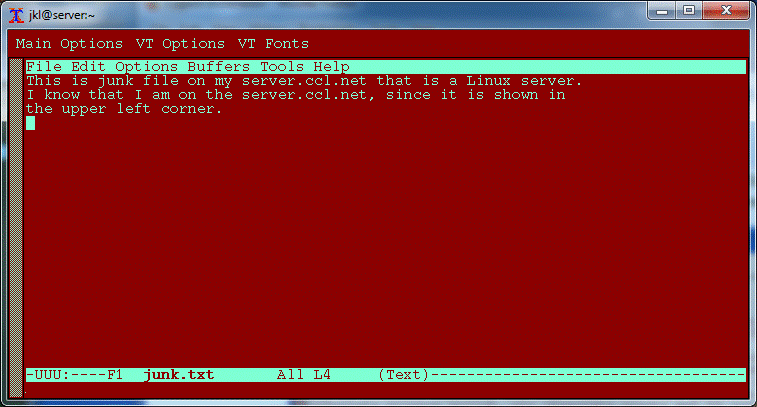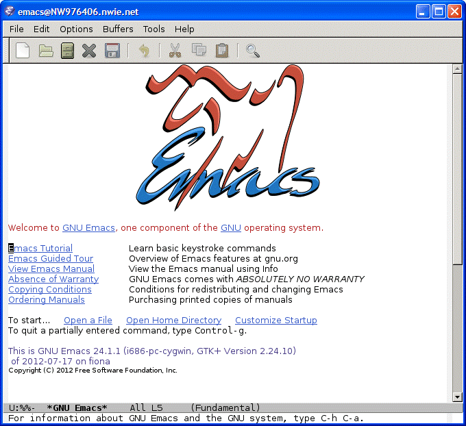 The Cygwin has the emacs editor. If you know and like vi, just skip this part. The Cygwin has vi as any other Unix system. If you realize that emacs is a more powerful editor and want to learn it, Cygwin is a good place to start. The emacs has in fact two variants: a plain text version, and the graphical version. If you type emacs for the first time in a Cygwin xterm you will get something like: