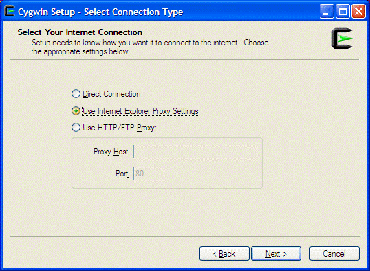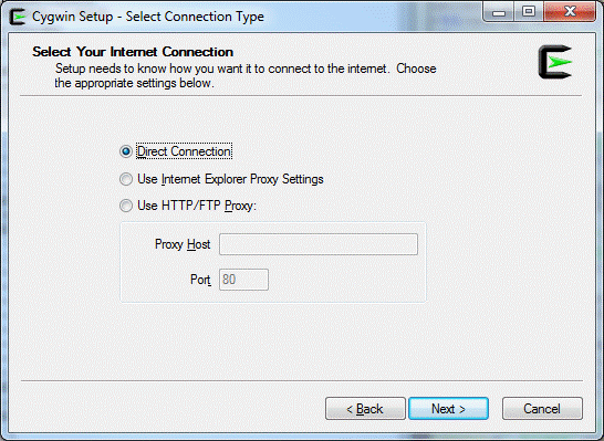 Click on [Next] and select Use Internet Explorer Proxy Setting. In the Some Company environment you will use the Direct Connection
