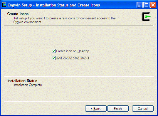 Make sure the Create icon on Desktop and the Add icon to Start Menu are selected. Then click on [Finish]. You may also get an error screen. Just do what it suggests, unless you cannot make any sense of it (sometimes nobody knows what they are actually saying). If this happens, just try to install Cygwin again from scratch but skip some packages, and plan on downloading them later. If still no go, then try to install only default Basic Cygwin and talk to some guru about your personal problems or google. It worked for me, but some things depend on how your Windoz is set up.