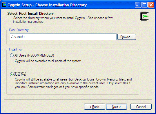 The next thing is the scope of the Cygwin installation. If you HAVE admin privileges, install Cygwin for All Users. If you do not, install Cygwin for Just Me. Check also if you have a D: drive as some companies partition the drives to give you the System Drive C: and the User Drive D:. Make sure that you do a right choice since your future lavel of frustration depends on it.