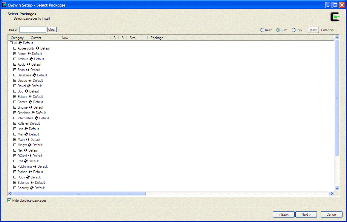 After you click on [Next] you will get a humongous list of software packages that is available for download within Cygwin. If you do not select anything explicitly, the setup.exe installer will only install a Base system that is pretty useless and limited. By clicking on [+] buttons you will see what packages are available. Now, you can activate the individual packages by clicking on the Skip (it will then change to a version number or a Keep or whatever). Of course, when there is no Skip by the package name, it is already selected. By clicking on the entry in this column multiple times you can go through all the options for the package. Here are some suggestions what you may want to include. But do not despair, since you can run setup.exe again to add or remove packages: