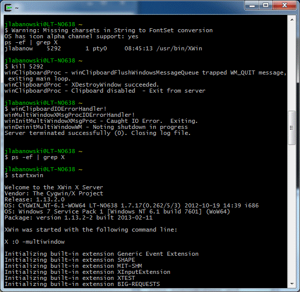 ps -ef | grep XWin jlabanow 5292 1 pty0 08:45:13 /usr/bin/XWin kill -9 5292 startxwin