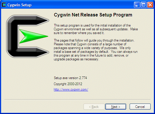Now you need to download the setup.exe, that is a Cygwin installer that will download and install Cygwin on your computer. Currently, there are 2 setup options: for 32-bit (setup-x86.exe) and for 64-bit (setup-x86_64.exe). Choose the one that corresponds to your windows version. Go to the site: http://cygwin.com/install.html and read it (I mean it, unless you already used Cygwin for a long time). Then click on setup.exe and Save/Run the setup.exe: